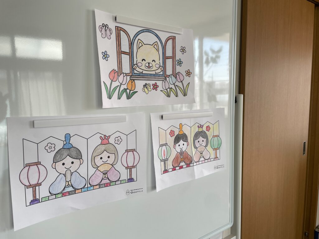 また、お雛様の塗り絵にも挑戦🖍️「どの色にしようかな?」と楽しみながら、素敵な作品が完成しました🌸